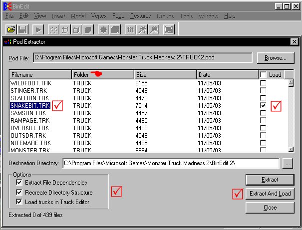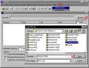 1) Go to the 'Tools' menu and select 'Pod Extractor'. Hit the 'Browse' button and navigate to your Truck2.pod. The default location is C:\Program Files\Microsoft Games\Monster Truck Madness 2. Select the Truck2.pod and hit 'Open'.
