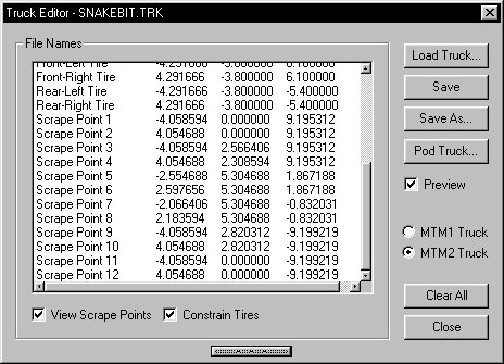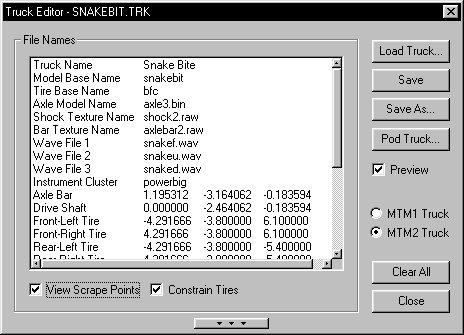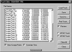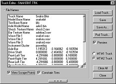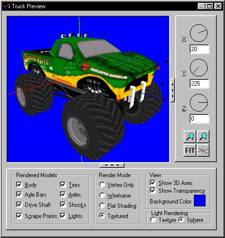 Note: Repainting any part of the truck or tires is done within the main BinEdit interface window (Texture Replacer) as are any direct model modifications, the truck editors purpose is to arrange and build a working .trk and .pod file only. Click on images to enlarge.